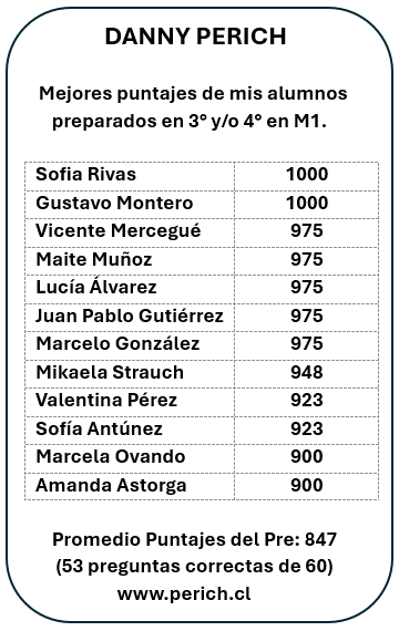- Guías, Ensayos y Libro «Rumbo a los 1000» todos creados por el profesor Perich, de acuerdo a los contenido actuales de la PAES M1.